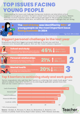 The latest annual Youth Survey by national charity Mission Australia received responses from 17,480 young people (aged 15-19) around the country on issues important to them in 2024. Here, we look at the top personal challenges they are facing.