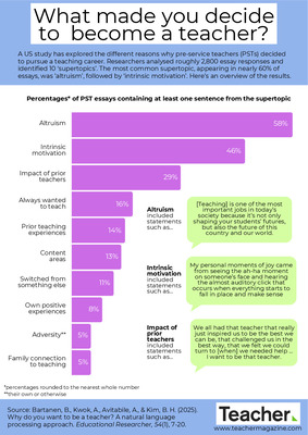 A US study has explored the different reasons why pre-service teachers (PSTs) decided to pursue a teaching career. Researchers analysed roughly 2,800 essay responses and identified 10 ‘supertopics’. The most common supertopic, appearing in nearly 60% of essays, was ’altruism’, followed by ‘intrinsic motivation’. This infographic gives an overview of the results.