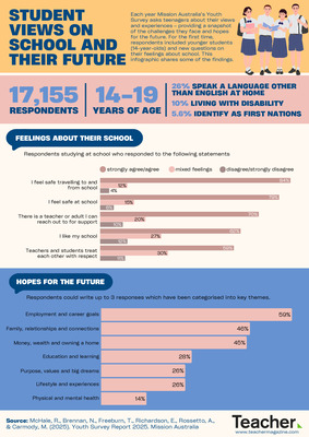 Each year Mission Australia’s Youth Survey asks teenagers about their views and experiences – providing a snapshot of the challenges they face and hopes for the future. For the first time, respondents included younger students (14-year-olds) and new questions on their feelings about school. This infographic shares some of the findings.